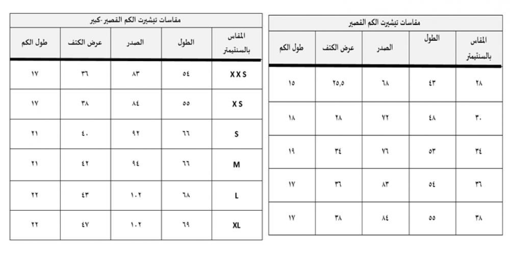 مقاسات التيشيرت