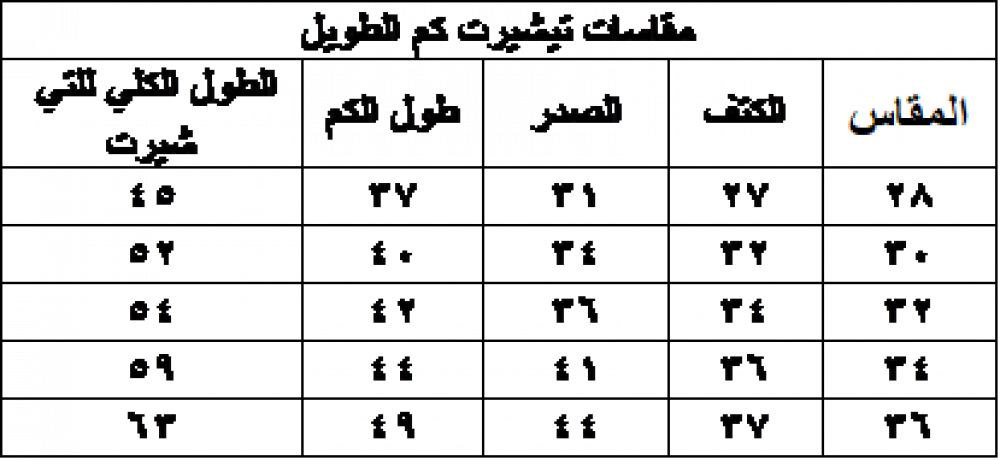 جدول مقاسات التيشيرت الكم الطويل