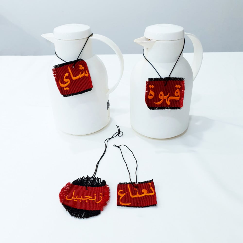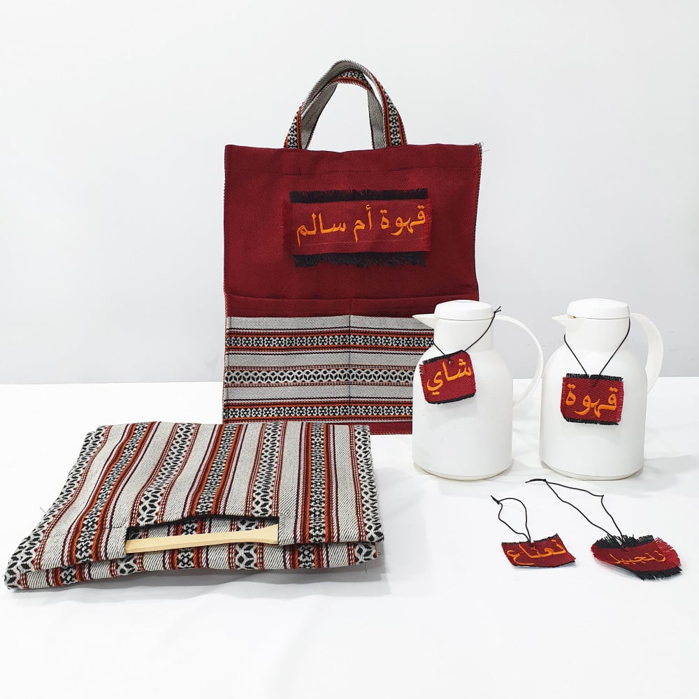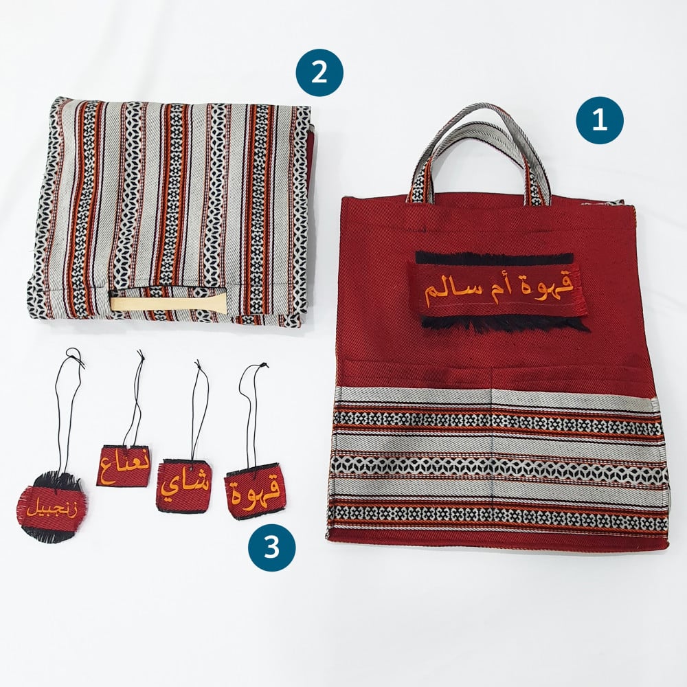 تبهج لمّتكم♥️☕ مجموعة تحتوي على شنطة للقهوة والدلّات، وتاقات للدلات بأسماء المشروبات، وكيس لصينية الحلى أو النقصة☕🛍️
