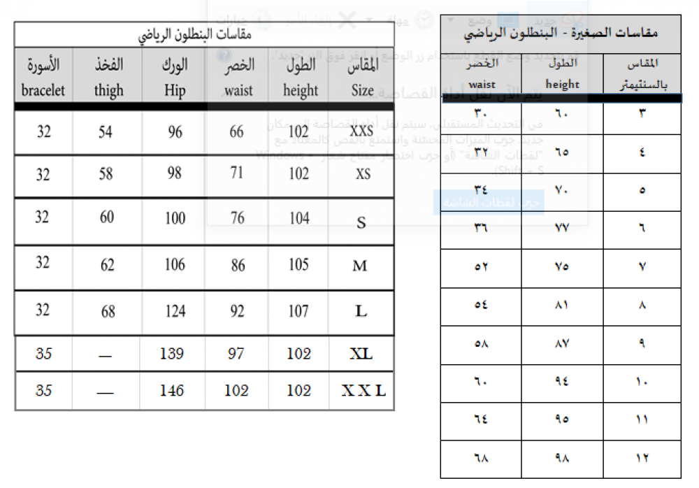 ملاحظة : تتوفر جداول مقاسات مختلفة في الصور