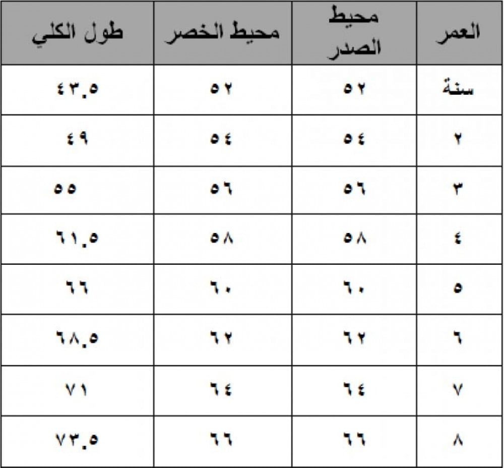 يتوفر جدول مقاسات للمنتج