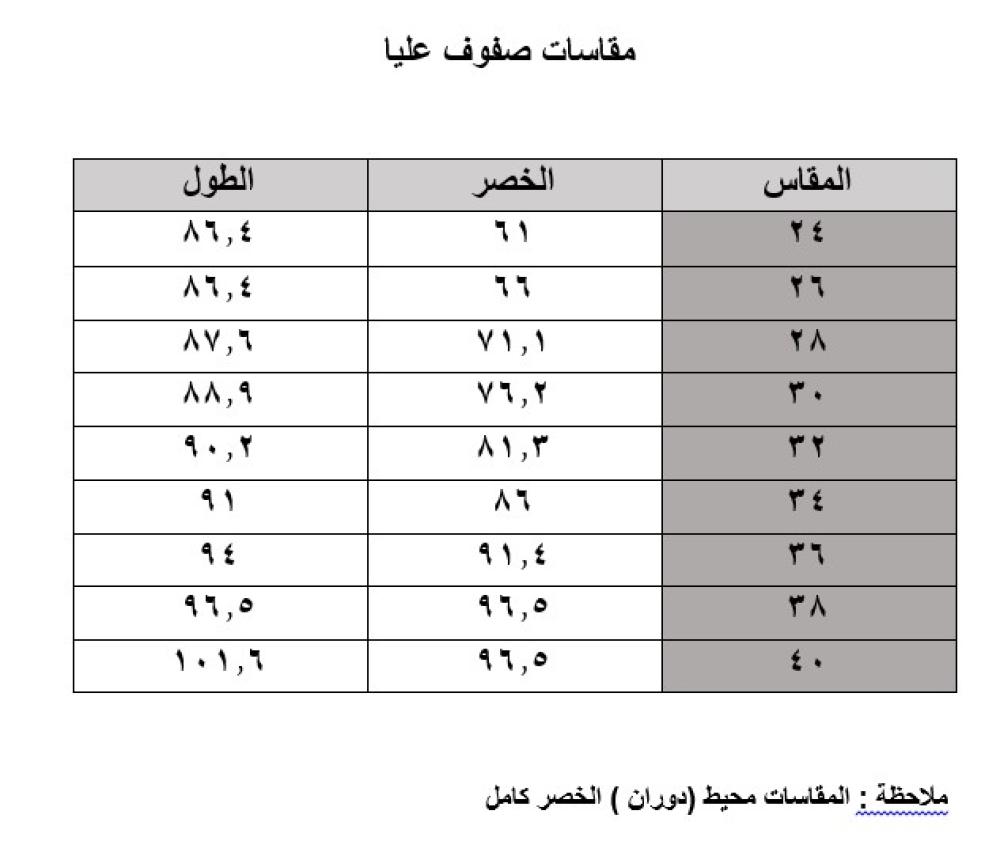 يوجد جدول مقاسات المنتج